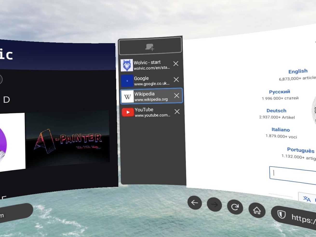 Additional improvements are planned in the coming months to help make Wolvic the best browser for XR experiences on the web. For example, we are also currently working on allowing windows to be positionined in more flexible ways, and adding buttons to the navigation bar to improve discoverability, and generally improving the situation with bookmarks, addons, history and downloads. We are also working on improving tabbed browsing by introducing a more familliar desktop-like tabbed interface (with both horizontal and vertical tab support).