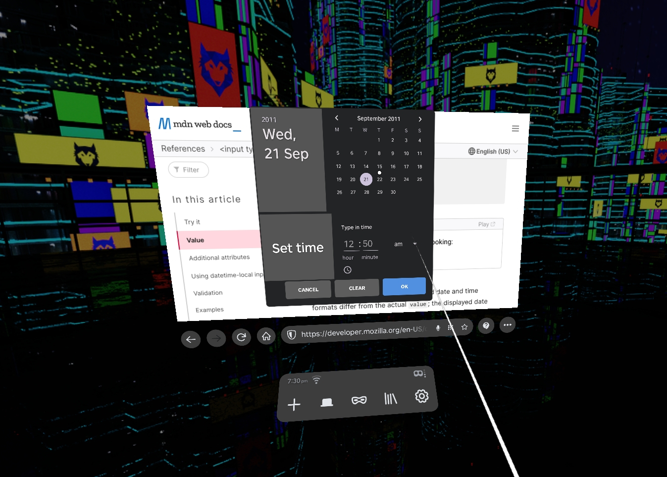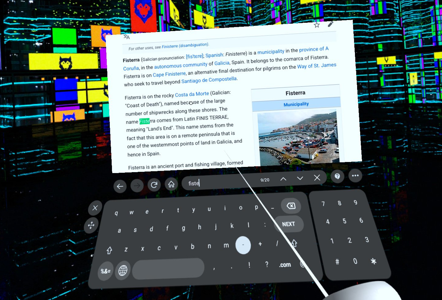 The second major UI improvement is the Find in Page feature, which works like it does in 2D browsers: you input a bit of text and Wolvic will highlight all occurrences of it in the page. You use arrow buttons to jump from one occurrence to the next (or to the previous) which can be very useful for finding specific bits of text in long pages like Wikipedia articles.